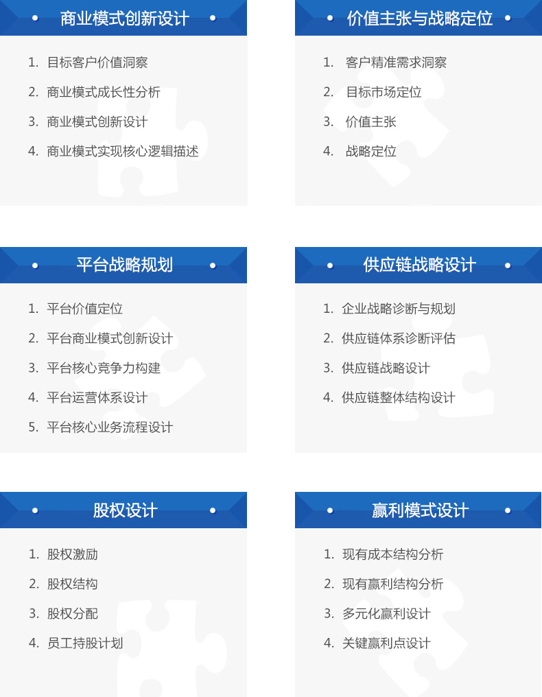 幫助企業(yè)發(fā)現(xiàn)消費者精準需求,實現(xiàn)目標(biāo)客戶精準定位,突破邊界,幫助企業(yè)整合資源,開放式創(chuàng)新,構(gòu)建多元化贏利模式與運營系統(tǒng),打造競爭壁壘,幫助企業(yè)打造實現(xiàn)持續(xù)贏利的系統(tǒng)。
